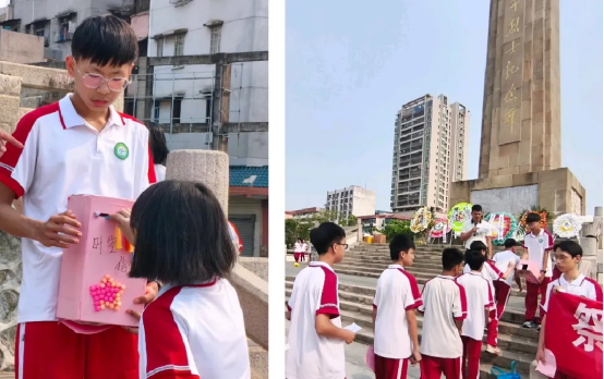 本次活动以“缅怀革命先烈 赓续红色血脉”为核心,各校紧扣要求盘活本地红色资源,线上线下同步推进。实地祭扫中,各校就近组织师生前往烈士陵园、爱国主义教育基地等红色阵地开展活动。大成中学、界炮中学等校师生亲手制作花圈,在烈士墓前完成敬献花圈、默哀鞠躬、宣誓致敬等庄重仪式;大成初中创设“时空信箱”,学生将提前书写的“最想对遂溪英烈说的一句话”现场投递,以文字架起少年与英雄的精神桥梁。多所学校还带领师生诵读祭文、重温入团入队誓词,全体师生在肃穆氛围中深切感悟幸福生活的来之不易。