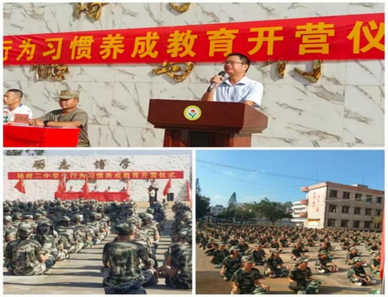 8 日上午,在庄严的国歌声中,学生行为习惯养成暨国防教育开营仪式拉开帷幕。杨柑二中党支部书记、校长陈聪作开营动员,他要求:一切行动听指挥;以军人标准锤炼自己,改变旧习;注重团队,共创荣誉;坚持到底,磨砺精神。他鼓励同学们珍惜这次“精神的洗礼 ”,从简单小事做起,追求卓越。