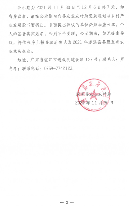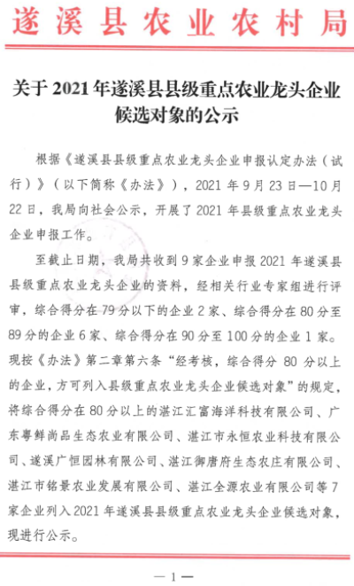 关于2021年遂溪县县级重点农业龙头企业候选对象的公示