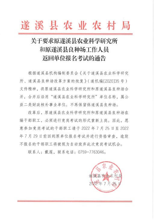 关于要求原遂溪县农业科学研究所和原遂溪县良种场工作人员返回单位报名考试的通告