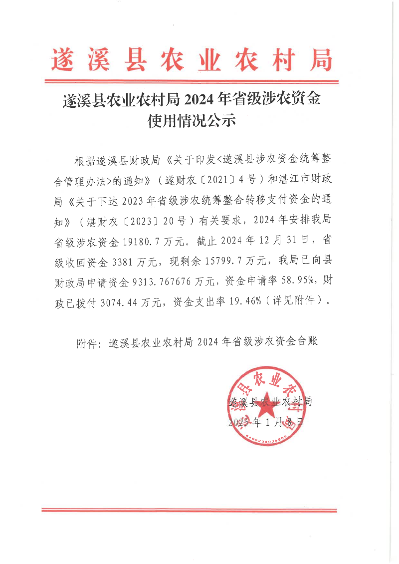 遂溪县农业农村局2024年省级涉农资金使用情况公示