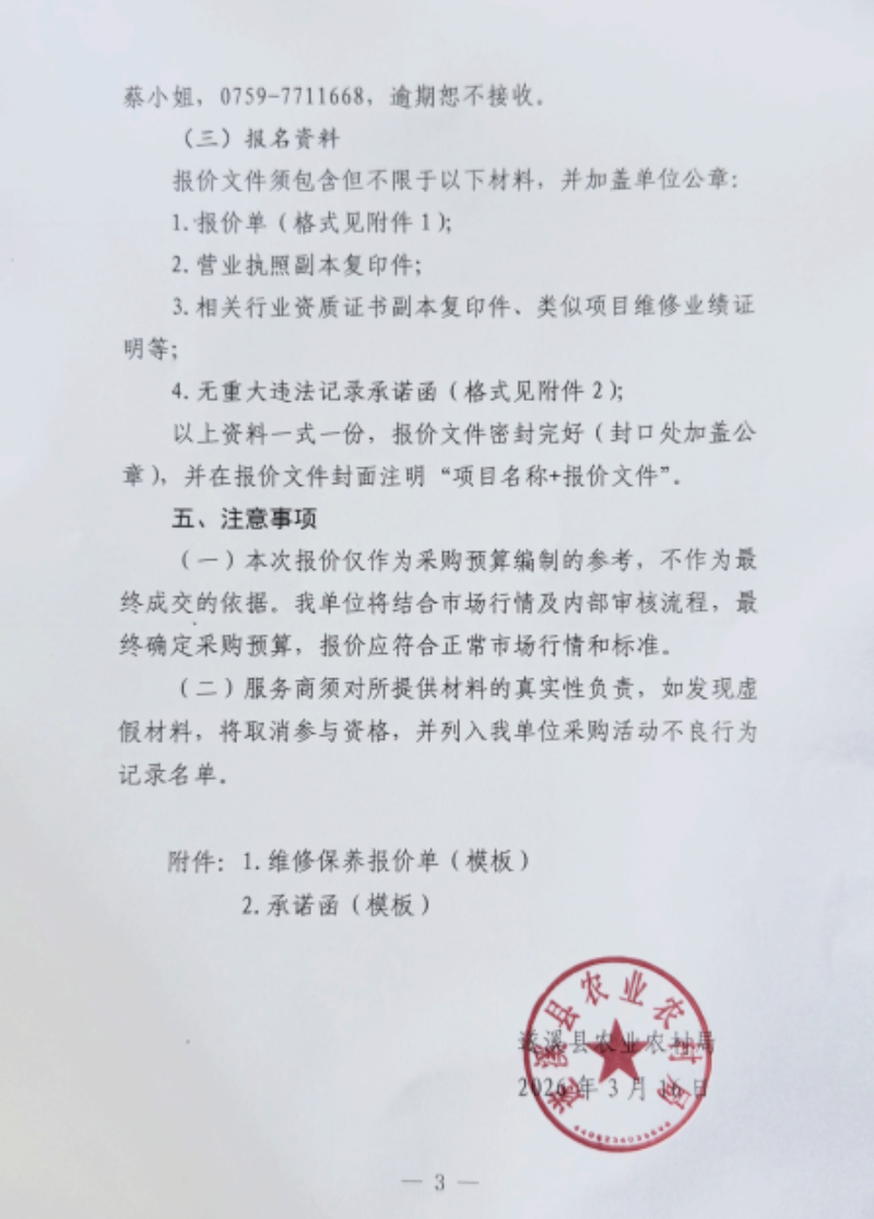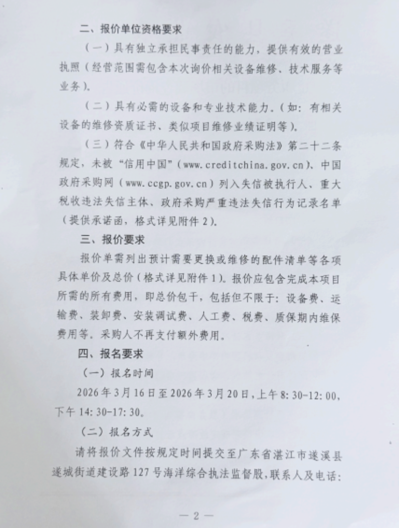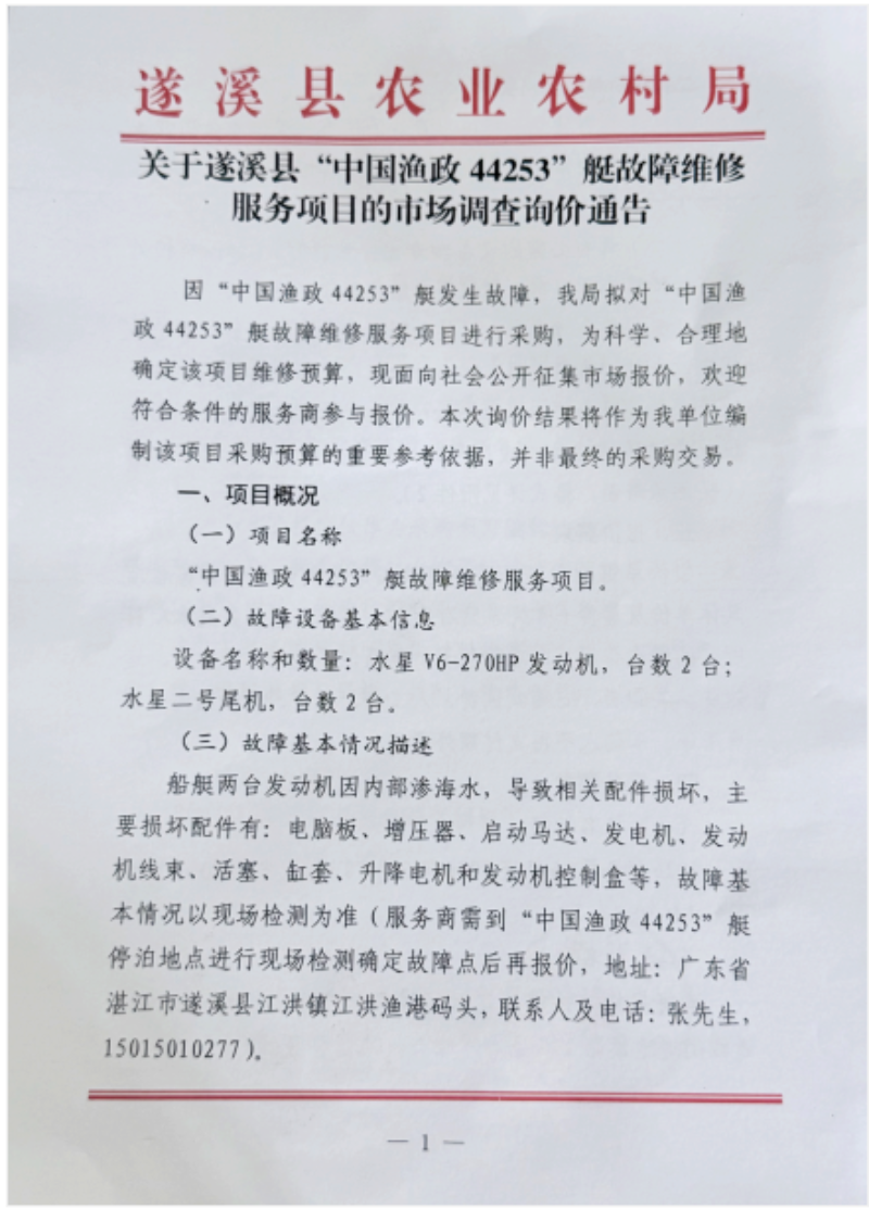 关于遂溪县“中国渔政44253”艇故障维修服务项目的市场调查询价通告