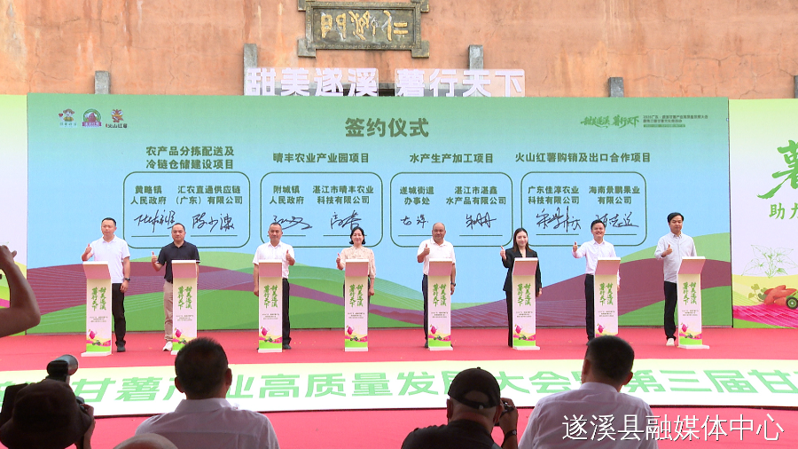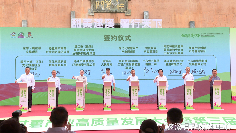 大会现场开展了遂溪甘薯产业专题推介,并举行政企合作签约仪式,一批项目现场签约落地。共招商签约15个项目,计划总投资47.44亿元。与会领导共同为国家甘薯产业技术体系成果示范基地(遂溪)、遂溪县甘薯产业发展研究中心揭牌,并共同启动大会及第三届甘薯文化周。
