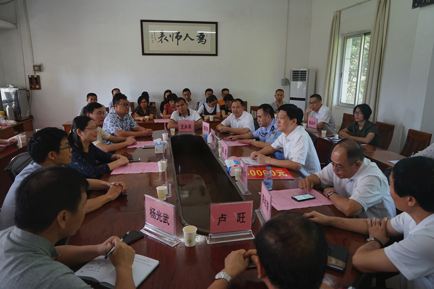 遂溪县大成中学创办于1985年,2000年晋升为湛江市一级学校,2015年在遂溪四中原基础上进行扩建改造。2019年,该校高考上线总人数1668人,上线率99.3%,创该校历史新高。在慰问座谈会上,陈政详细了解了学校建设、教师队伍建设等情况,并现场帮助学校解决当前遇到的难题。陈政指出,近年来,我县教育事业快速发展,教学质量稳步提高,有力推动了全县经济社会平稳健康发展。这些成绩的取得,离不开广大教师和教育工作者一直以来的辛勤耕耘、无私奉献。陈政希望,学校领导班子要继续发扬优良传统、凝心聚力,以培养学生核心素养为导向,积极探索“文体兼修,多元发展”的特色办校之路,在教育教学、德育工作、校园文化建设等方面取得更优异的成绩。随后,黄小平代表县委县政府为学校送上慰问金。