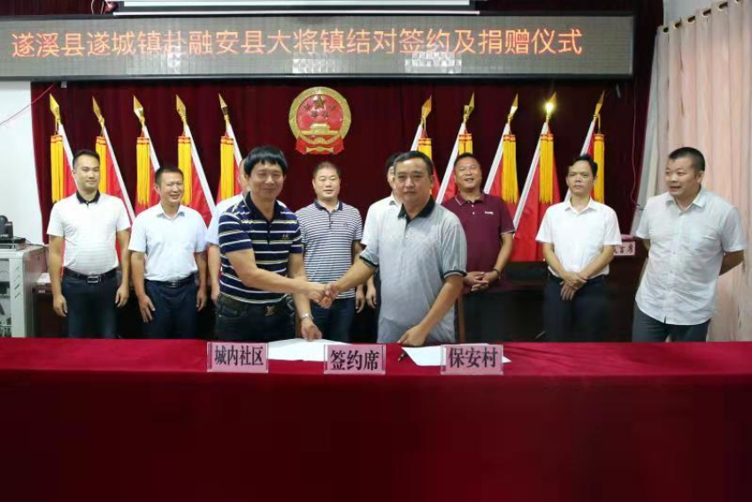 9月12日,在融安县大将镇举行了扶贫协作镇村结对帮扶座谈会,遂城镇陈泽和镇长、遂城镇城内社区支书廖窕权以及大将镇罗财政书记、大将镇保安村支书周玉健先后介绍了各自镇村基本情况,双方就脱贫攻坚、产业发展、党建工作、以及自然资源禀赋进行了交流探讨,并就下一步如何开展消费扶贫促进扶贫协作镇村结对帮扶实效等进行了深入讨论。座谈会上,遂城镇与大将镇、遂城镇城内社区与大将镇保安村分别签订了结对帮扶协议,遂城镇向大将镇捐赠了8万元的帮扶资金和16辆电动车,用于解决扶贫工作队员进村入户时的交通工具问题。城内社区向保安村捐赠资金2万元。