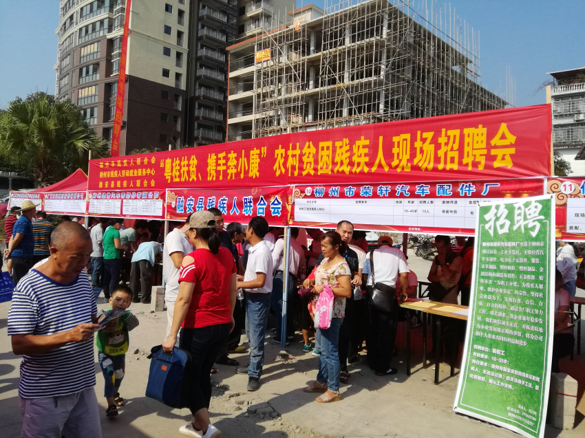 9月29日,由融安、遂溪两县残联、人社部门在融安县大码头广场举办残疾人专场招聘会,现场有来自广东企业、粤桂扶贫协作引进融安的企业、柳州地区等多家企业、单位前来招聘。融安县委常委、副县长刘喜出席活动。
