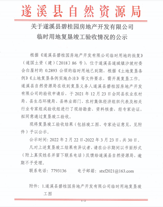关于遂溪县碧桂园房地产开发有限公司临时用地土地复垦竣工验收情况的公示