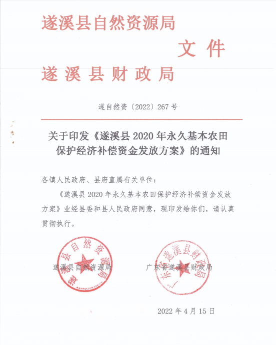 附件.遂自然资【2022】267号 关于印发《遂溪县2020年永久基本农田保护经济补偿资金发放方案》.pdf