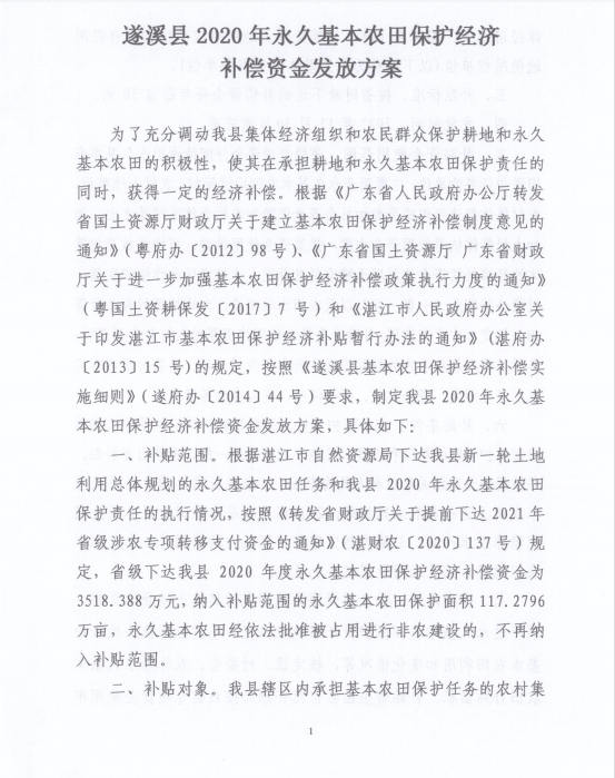关于印发《遂溪县2020年永久基本农田保护经济补偿资金发放方案》的通知