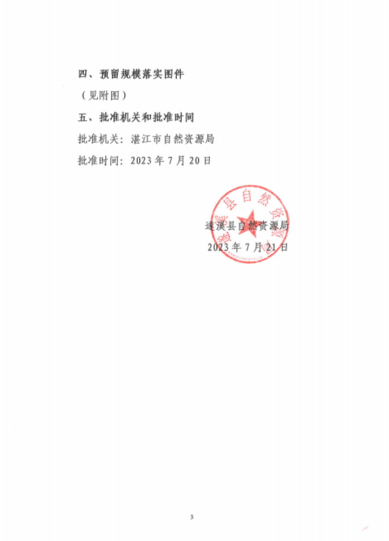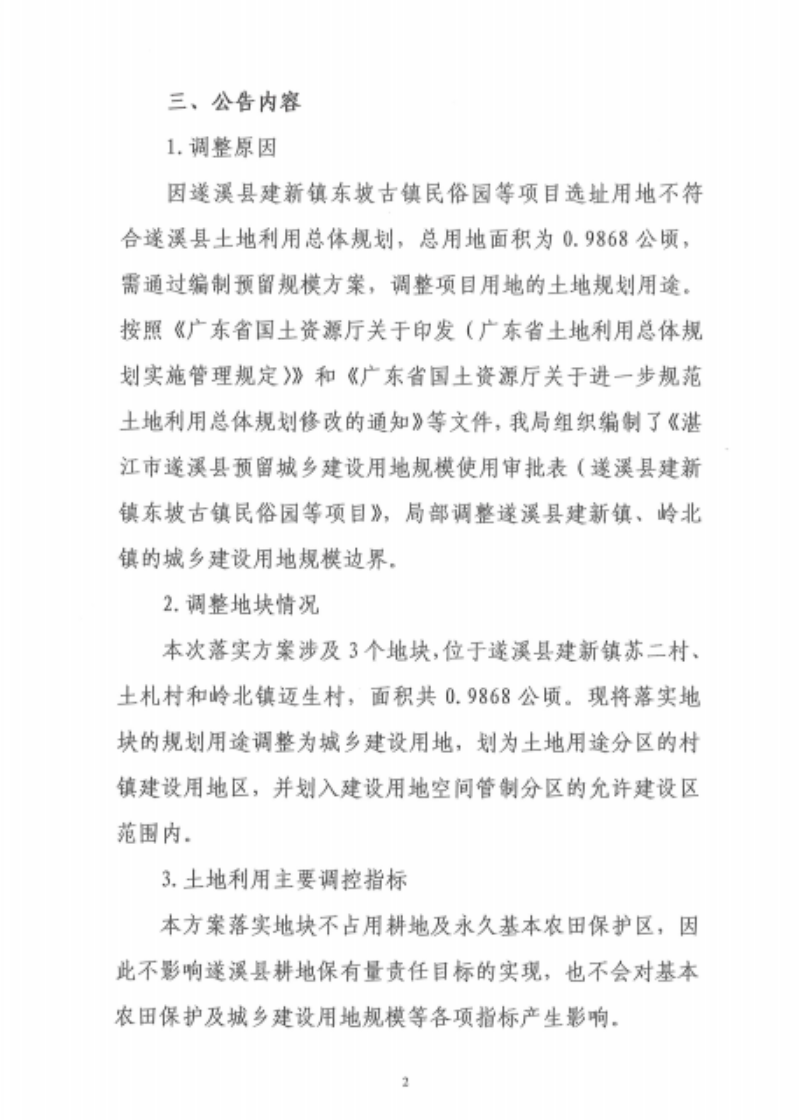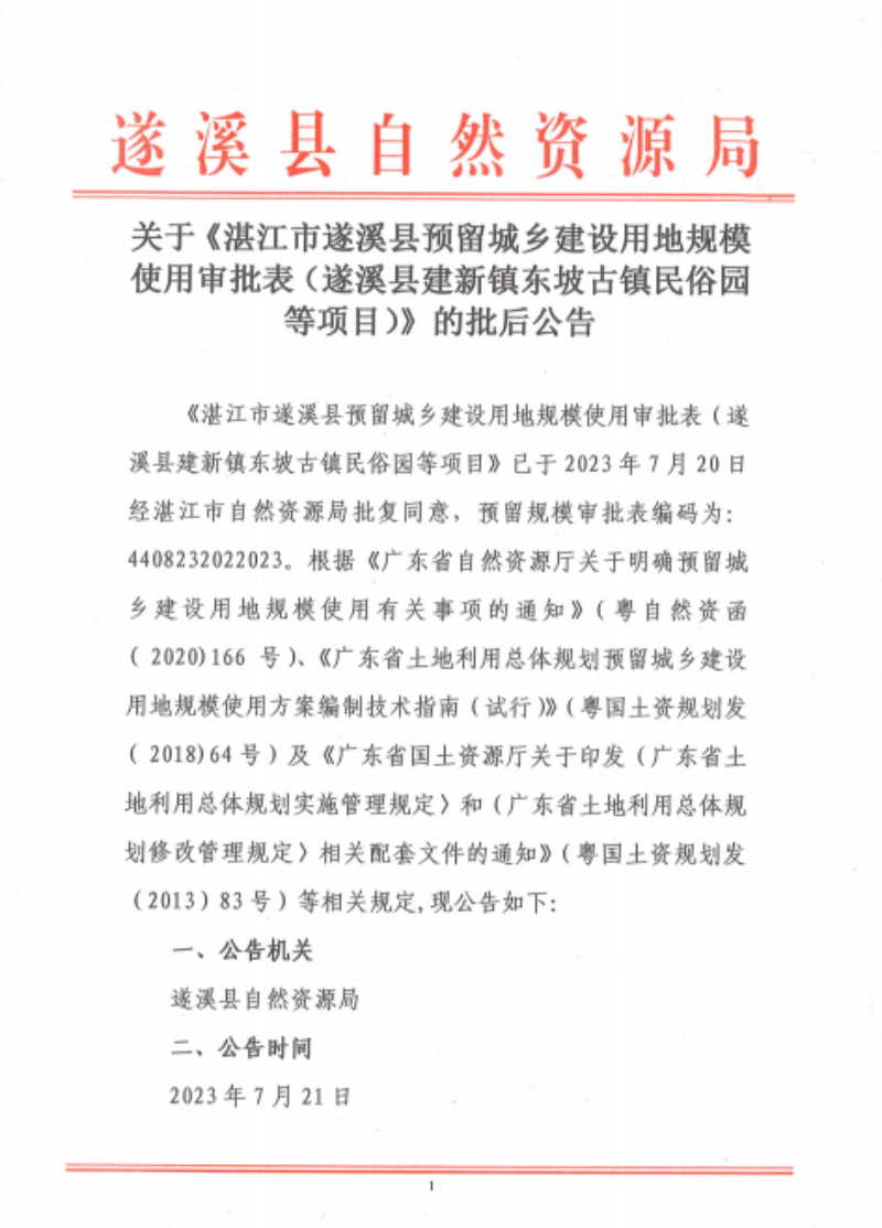 关于《湛江市遂溪县预留城乡建设用地规模使用审批表(遂溪县建新镇东坡古镇民俗园等项目)》的批后公告