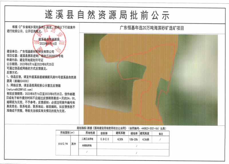 广东恒基年选20万吨海滨砂矿选项目建设用地规划许可证批前公示