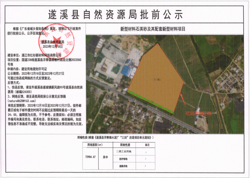 新型材料石英砂及其配套新型材料项目建设用地规划许可证批前公示