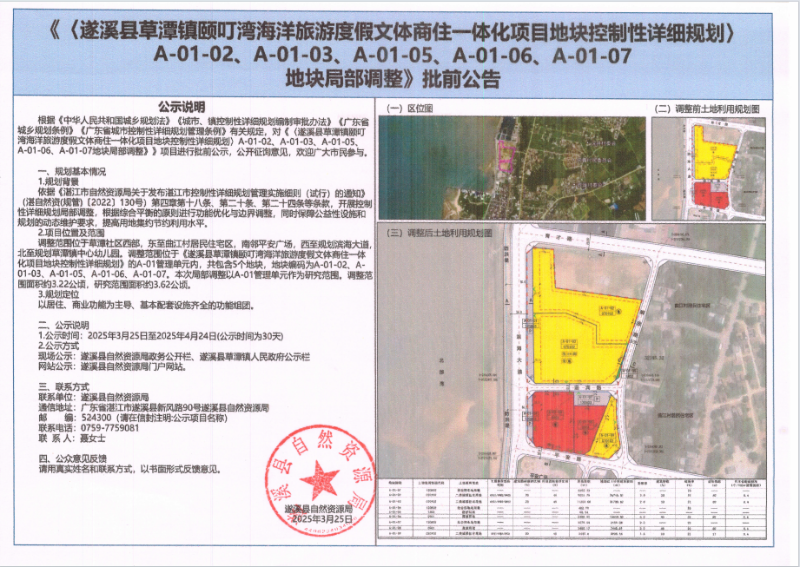 《〈遂溪县草潭镇颐叮湾海洋旅游度假文体商住一体化项目地块控制性详细规划〉A-01-02、A-01-03、A-01-05、A-01-06、A-01-07地块局部调整》批前公告