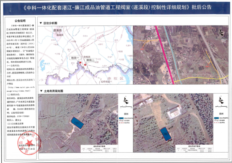 《中科一体化配套湛江-廉江成品油管道工程阀室(遂溪段)控制性详细规划》批后公告