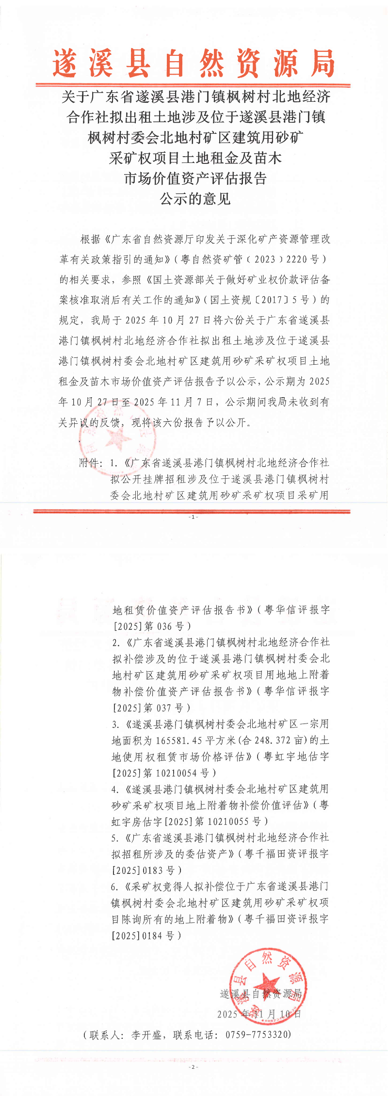 1.《广东省遂溪县港门镇枫树村北地经济合作社拟公开挂牌招租涉及位于遂溪县港门镇枫树村委会北地村矿区建筑用砂矿采矿权项目采矿用地租赁价值资产评估报告书》粤华信评报字[2025]第036号.pdf