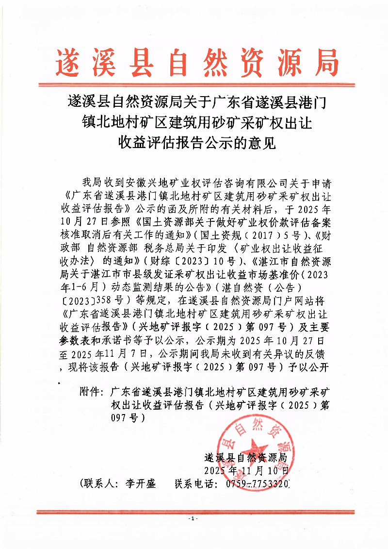 遂溪县自然资源局关于广东省遂溪县港门镇北地村矿区建筑用砂矿采矿权出让收益评估报告公示的意见