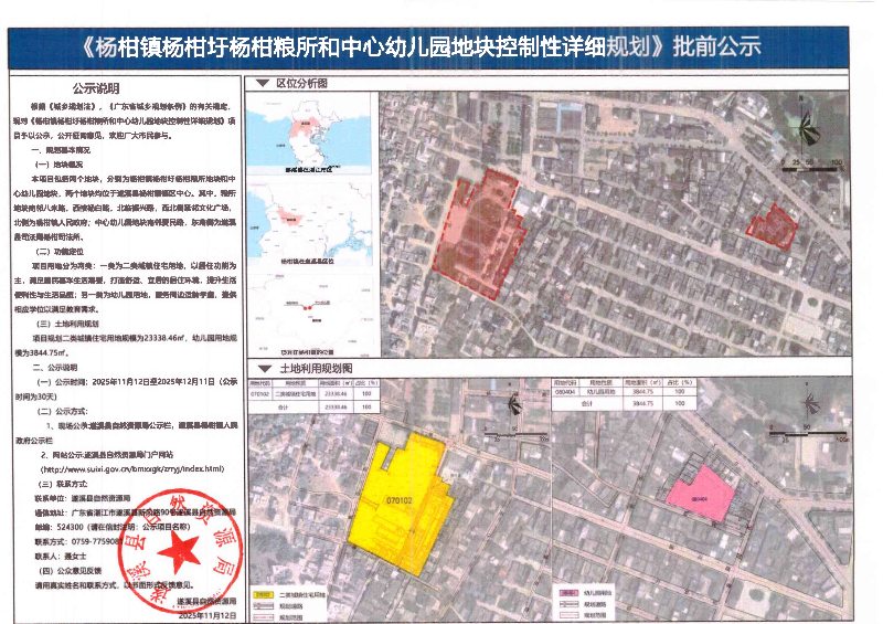 《杨柑镇杨柑圩杨柑粮所和中心幼儿园地块控制性详细规划》批前公示
