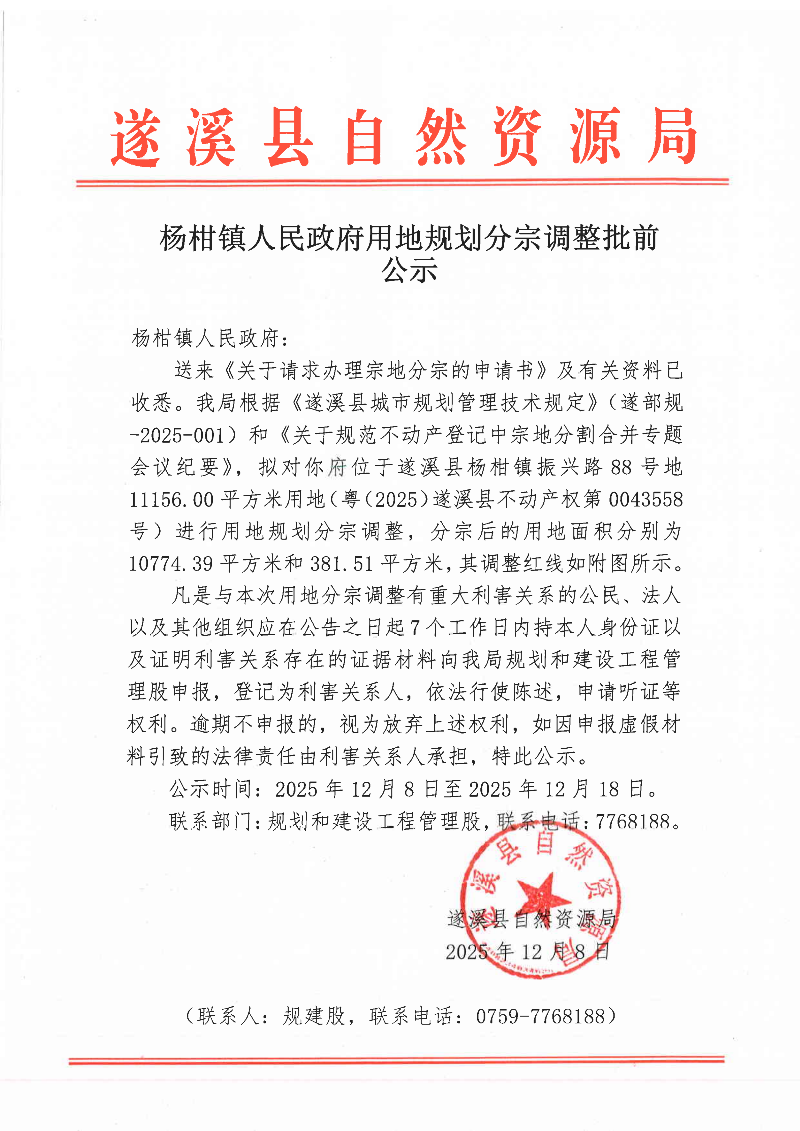 杨柑镇人民政府用地规划分宗调整批前公示