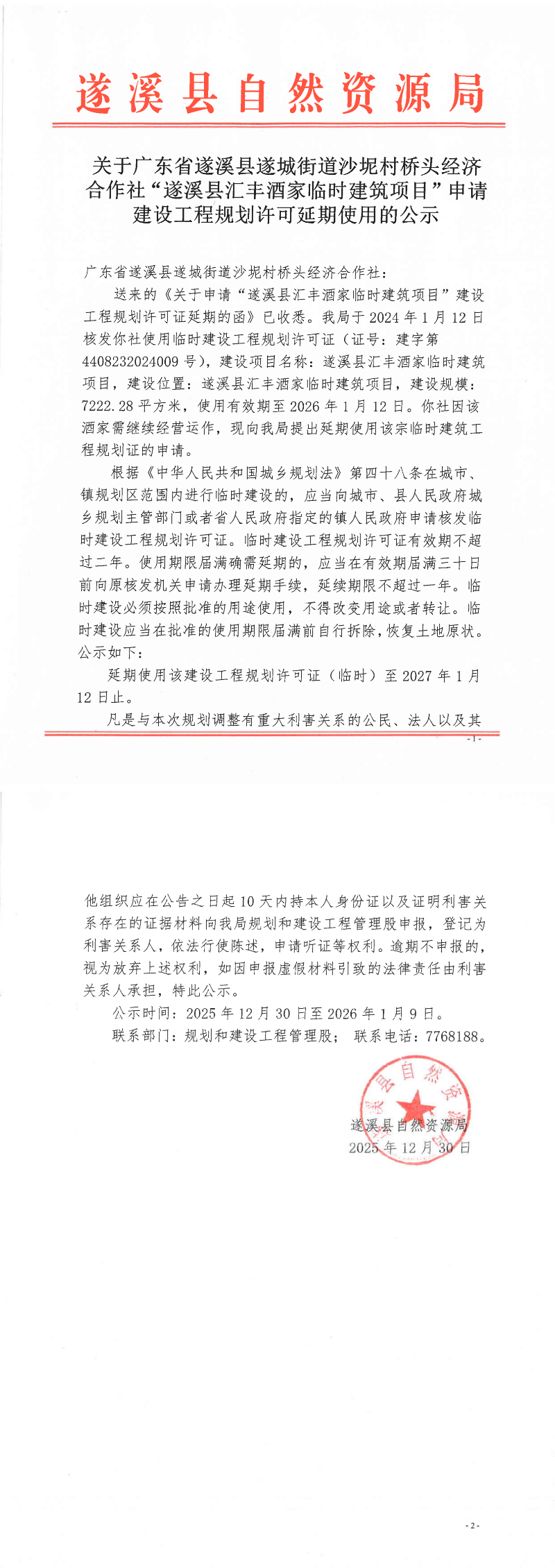 关于广东省遂溪县遂城街道沙泥村桥头经济合作社“遂溪县汇丰酒家临时建筑项目”申请建设工程规划许可延期使用的公示
