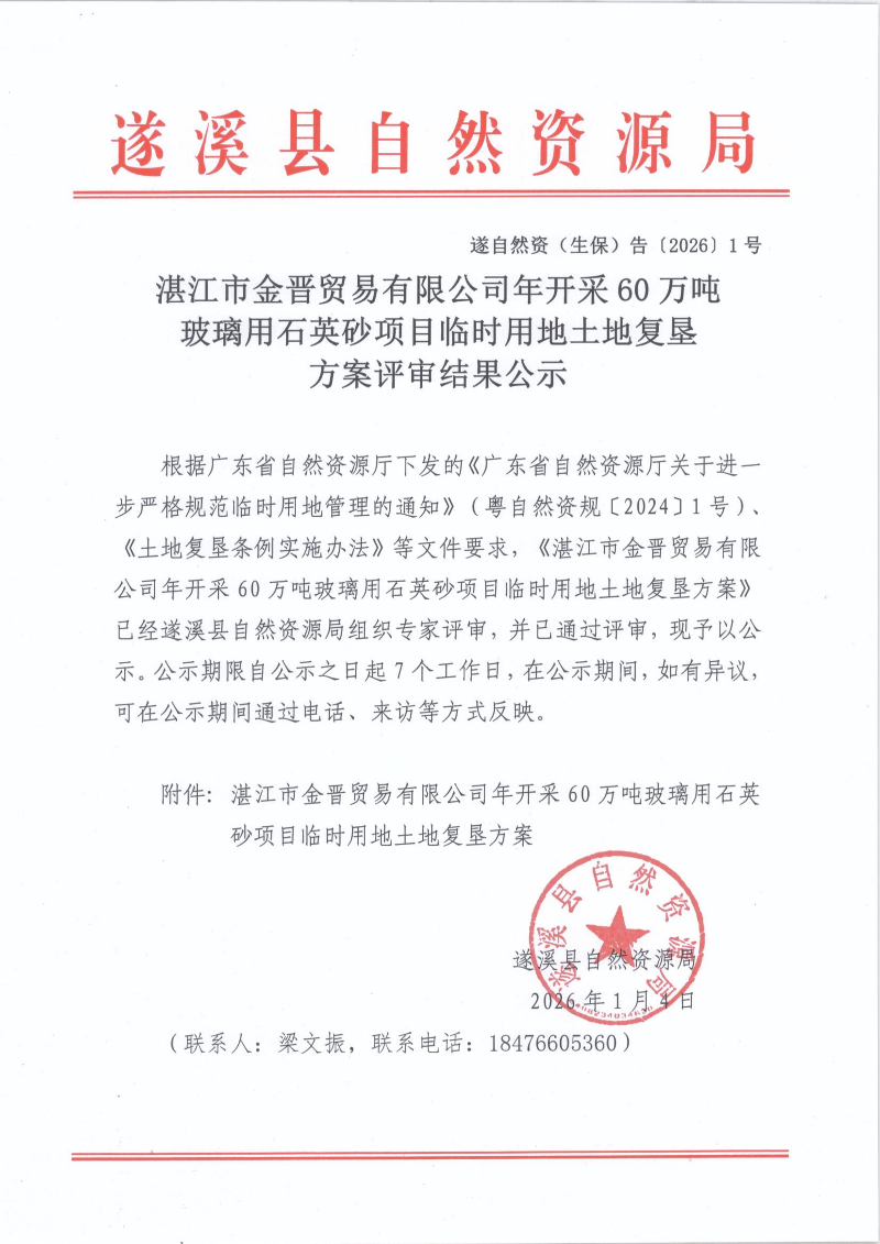 湛江市金晋贸易有限公司年开采60万吨玻璃用石英砂项目临时用地土地复垦方案评审结果公示