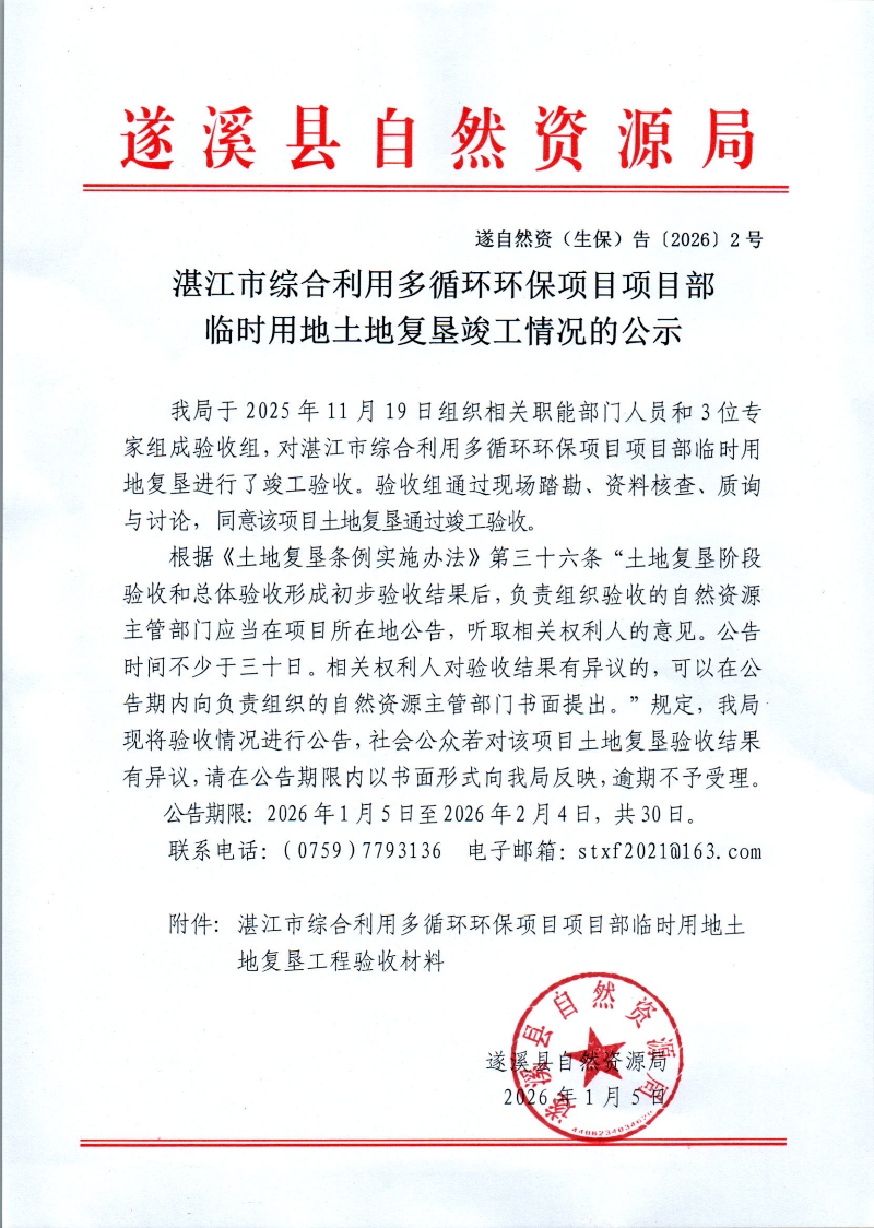湛江市综合利用多循环环保项目项目部临时用地土地复垦竣工情况的公示