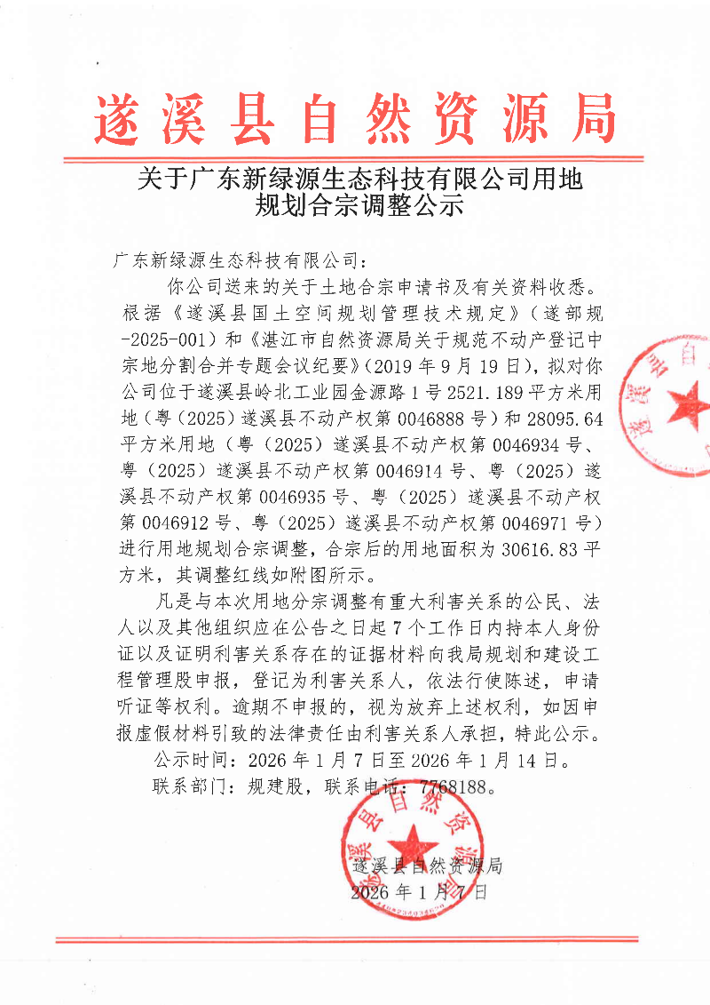 关于广东新绿源生态科技有限公司用地规划合宗调整公示