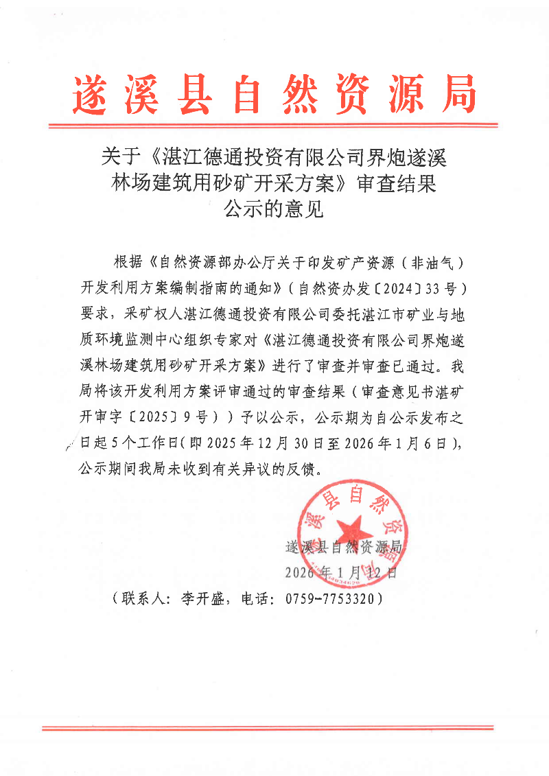 关于《湛江德通投资有限公司界炮遂溪林场建筑用砂矿开采方案》审查结果公示的意见