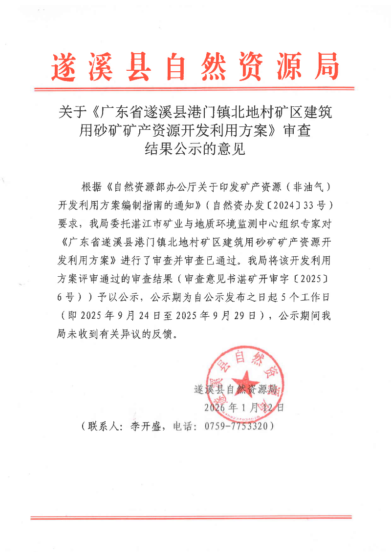 关于《广东省遂溪县港门镇北地村矿区建筑用砂矿矿产资源开发利用方案》审查结果公示的意见