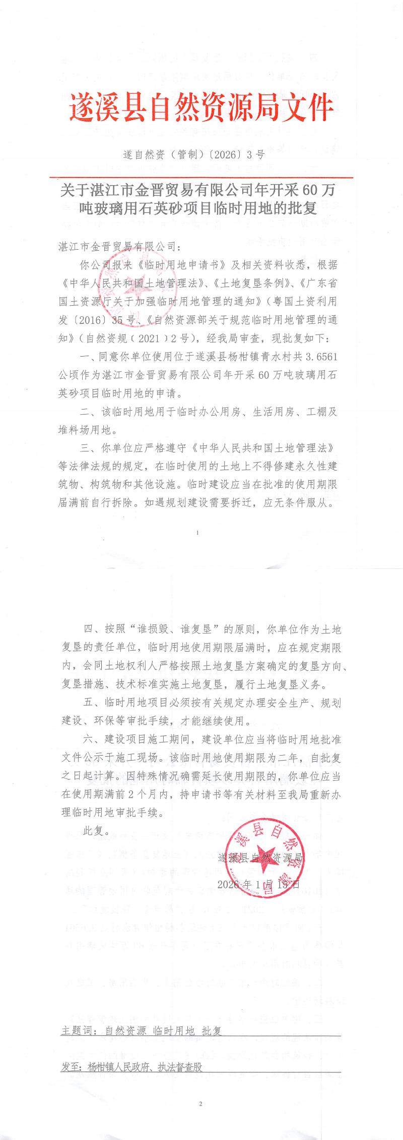 关于湛江市金晋贸易有限公司年开采60万吨玻璃用石英砂项目临时用地的批复