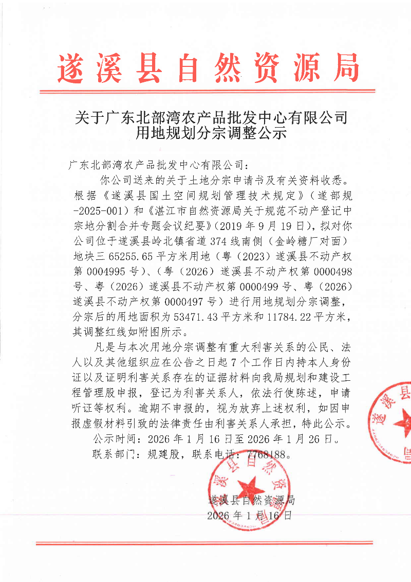 关于广东北部湾农产品批发中心有限公司用地规划分宗调整公示
