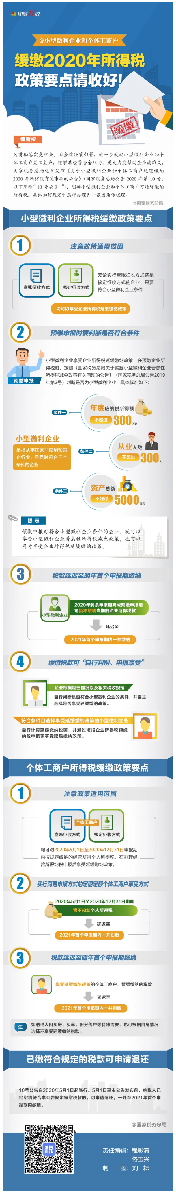 为贯彻落实党中央、国务院决策部署,进一步鼓励小型微利企业和个体工商户复工复产,缓解其经营资金压力,更大力度帮助企业渡难关,国家税务总局近日发布《国家税务总局关于小型微利企业和个体工商户延缓缴纳2020年所得税有关事项的公告》(国家税务总局公告2020年第10号),明确小型微利企业和个体工商户可延缓缴纳所得税。具体如何规定?怎样办理?一张图为你梳理。