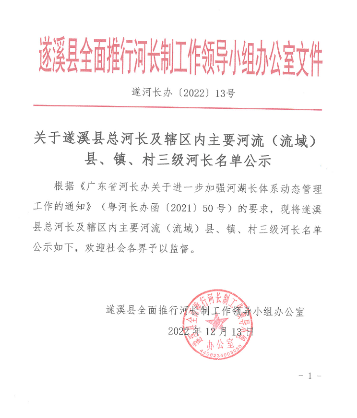 关于遂溪县总河长及辖区内主要河流(流域)县、镇、村三级河长公示 | | 作者: | 来源:遂溪县全面推进河长制领导小组办公室 | 时间:2022-12-13 14:41:39 点击数:- (遂河长办【2022】13号)关于遂溪县总河长及辖区内主要河流(流域)县、镇、村三级河长公示.pdf 【打印正文】