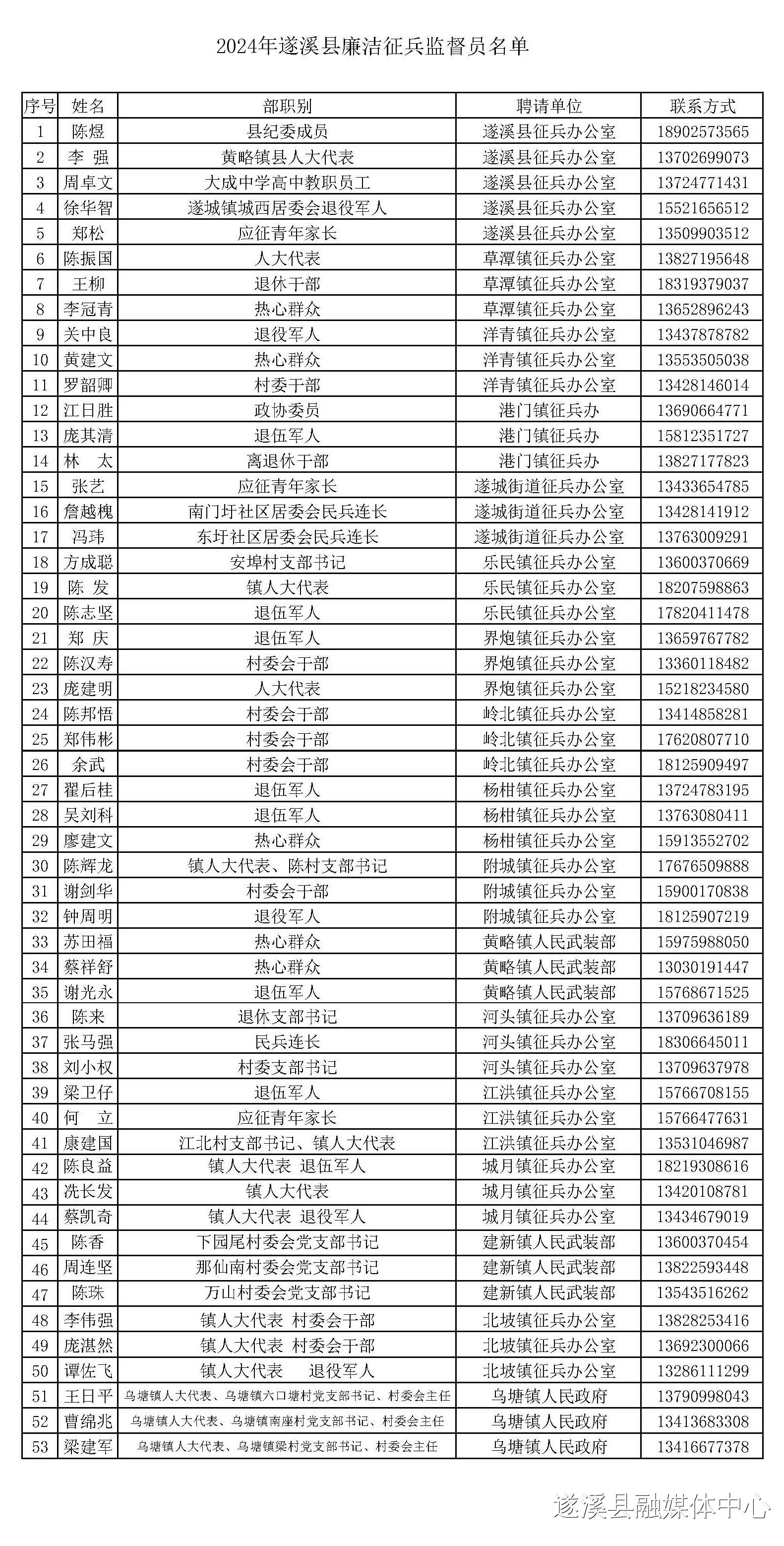 关于2024年遂溪县廉洁征兵监督员名单的公示