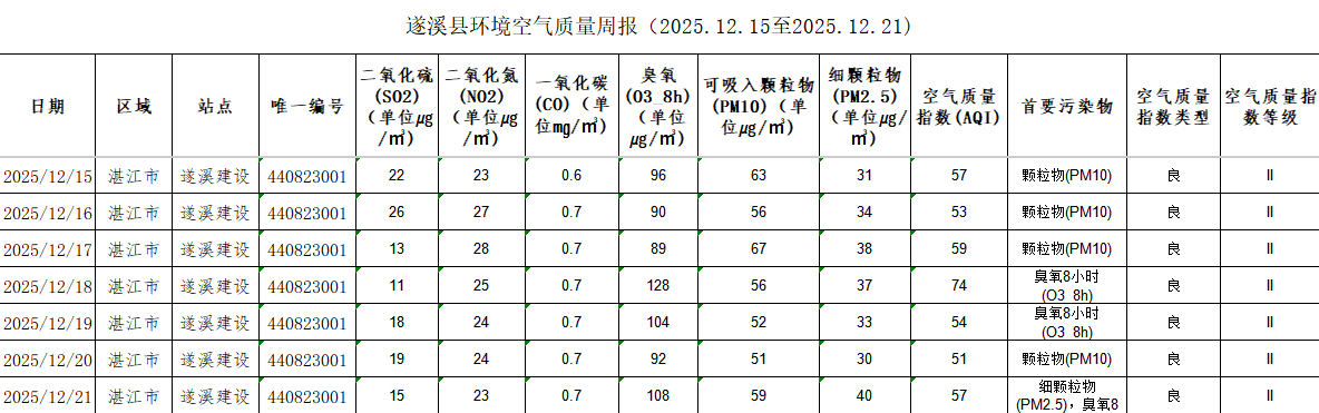 遂溪县环境空气质量周报(2025.12.15至2025.12.21)