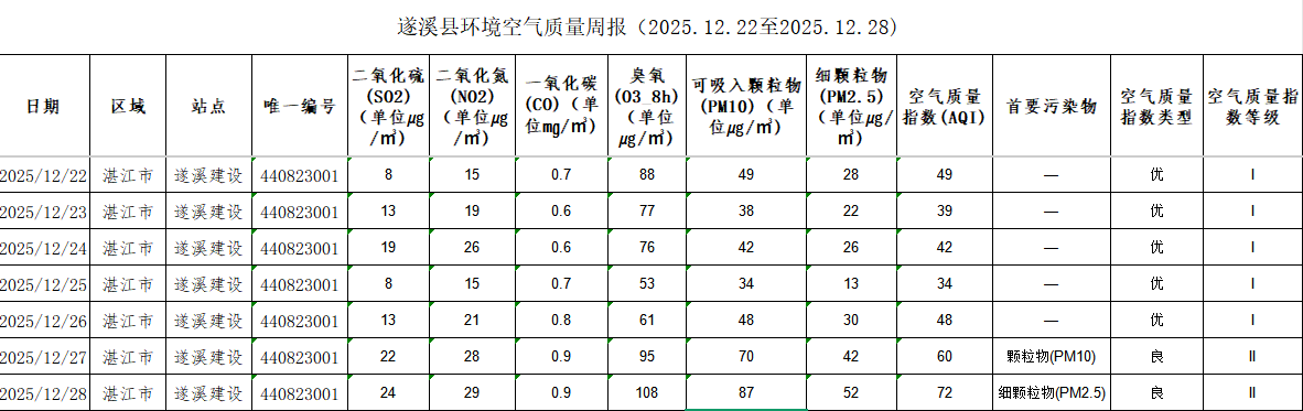 遂溪县环境空气质量周报(2025.12.22至2025.12.28)