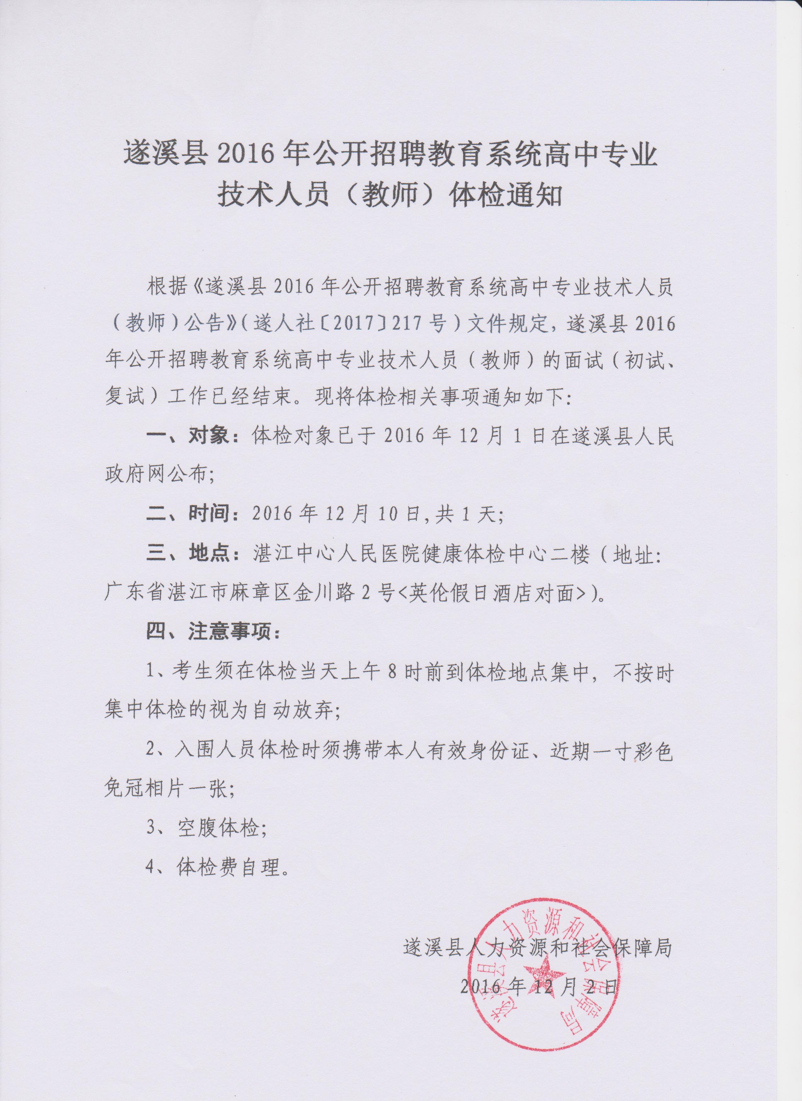 遂溪县2016年公开招聘教育系统高中专业技术人员(教师)体检通知