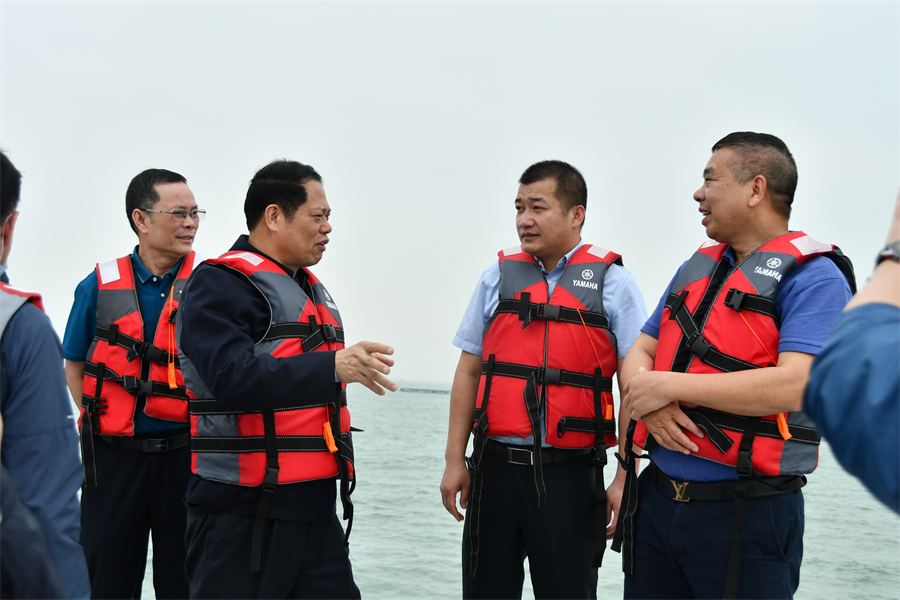 调研组一行来到湛江汇富海洋科技有限公司金鲳鱼深海网箱养殖场,现场考察金鲳鱼深海网箱养殖情况,在考察过程中,陈才君一行人与镇党委书记林立、公司负责人徐向东进行深入交流,仔细询问金鲳鱼养殖情况,了解产业规模、养殖效益、渔业种苗培育等相关情况。