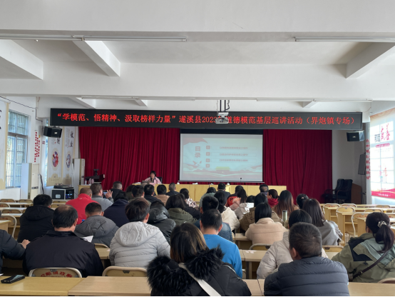 为深入学习宣传道德模范及身边好人的感人事迹,大力弘扬社会主义核心价值观,充分发挥道德模范的示范引领作用,营造崇德向善、见贤思齐的良好氛围。助力“百县千镇万村高质量发展工程”,推动城乡精神文明建设融合发展。12月20日下午,界炮镇联合中国农业银行遂溪县支行在镇新时代文明实践所举办2023年“学模范、悟精神、汲取榜样力量”道德模范宣讲活动。此次宣讲活动邀请到第二届“遂溪好人”、遂溪县博物馆馆长王小清女士进行宣讲,镇各级党支部代表共计40余人聆听了道德模范的先进事迹。
