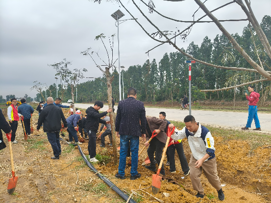 活动现场暖意融融、干劲十足。党旗飘在植树一线,党员冲在绿美前沿,全体党员干部亮身份、作表率,手持工具、分区作业、有序劳作。镇领导班子成员率先垂范、以身作则,带头挥锹铲土、扶苗正苗、覆土培实、浇水灌溉,每一道工序规范娴熟、一丝不苟,充分发挥“头雁效应”,以实际行动践行党员初心使命;各村(社区)、个协党支部书记主动担当,带领身边党员群众分工协作、密切配合;各机关单位、镇中层干部立足岗位、履职尽责,把植树现场作为锤炼党性、服务群众的实践课堂;驻村工作队全程参与植树劳作,同步谋划后续苗木管护,确保种一棵、活一棵、成一棵,切实把组织优势转化为生态建设实效。