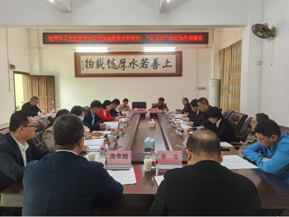 2025年11月27日上午,越秀区与遂溪县对口医疗帮扶工作交流座谈会在遂溪县建新镇人民政府三楼会议室召开。会议由遂溪县卫生健康局副局长陈裕权主持,越秀区卫生健康局党组书记、局长罗振佳和遂溪县人民政府副县长洪武松等双方代表出席。