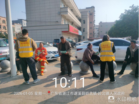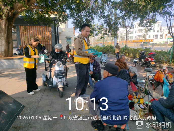为切实守护辖区群众尤其是老年人出行安全,夯实农村道路交通安全管理基础,1月5日,岭北镇应急办在金岭广场开展交通安全宣传工作。针对老年人交通安全宣传,发放宣传资料、现场讲解典型案例等方式,用通俗易懂的语言向老年人普及骑乘非机动车佩戴安全头盔、遵守交通信号灯等安全知识,详细解读交通违法行为的危害性,引导老年人树立"安全出行"的理念,坚决做到“两个不出村”,全力守护好群众安全出行。