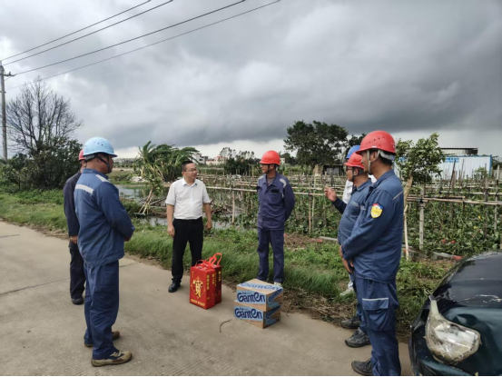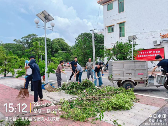 台风过境后,为尽快恢复平和与秩序,镇党委、政府第一时间进行部署,迅速组织 35 支救援队伍,统筹调配挖掘机、装载机、清运车等作业设备,以“先通后净、全面覆盖”为原则,对辖区内主次干道、背街小巷等周边重点区域开展集中清理行动。在清运车难以驶入的狭窄巷道,志愿者们带着铁锹、扫帚、垃圾袋等工具,逐一清理墙角、绿化带内的杂物,并协助商铺检查广告牌,对轻微倾斜的小型广告牌,合力进行手动加固,对存在严重安全隐患的广告牌,则及时标记并联系专业人员处理,全力守护行人脚下的安全。镇党委书记亲赴电力抢修现场,慰问坚守一线的供电维修人员,为他们送去饮用水等慰问品,洪文泽书记指出:电力是群众生活保障的关键,要在确保安全的前提下,争分夺秒推进抢修,尽快恢复全镇供电,让群众能点亮家里的灯、做好团圆饭,安稳过中秋。