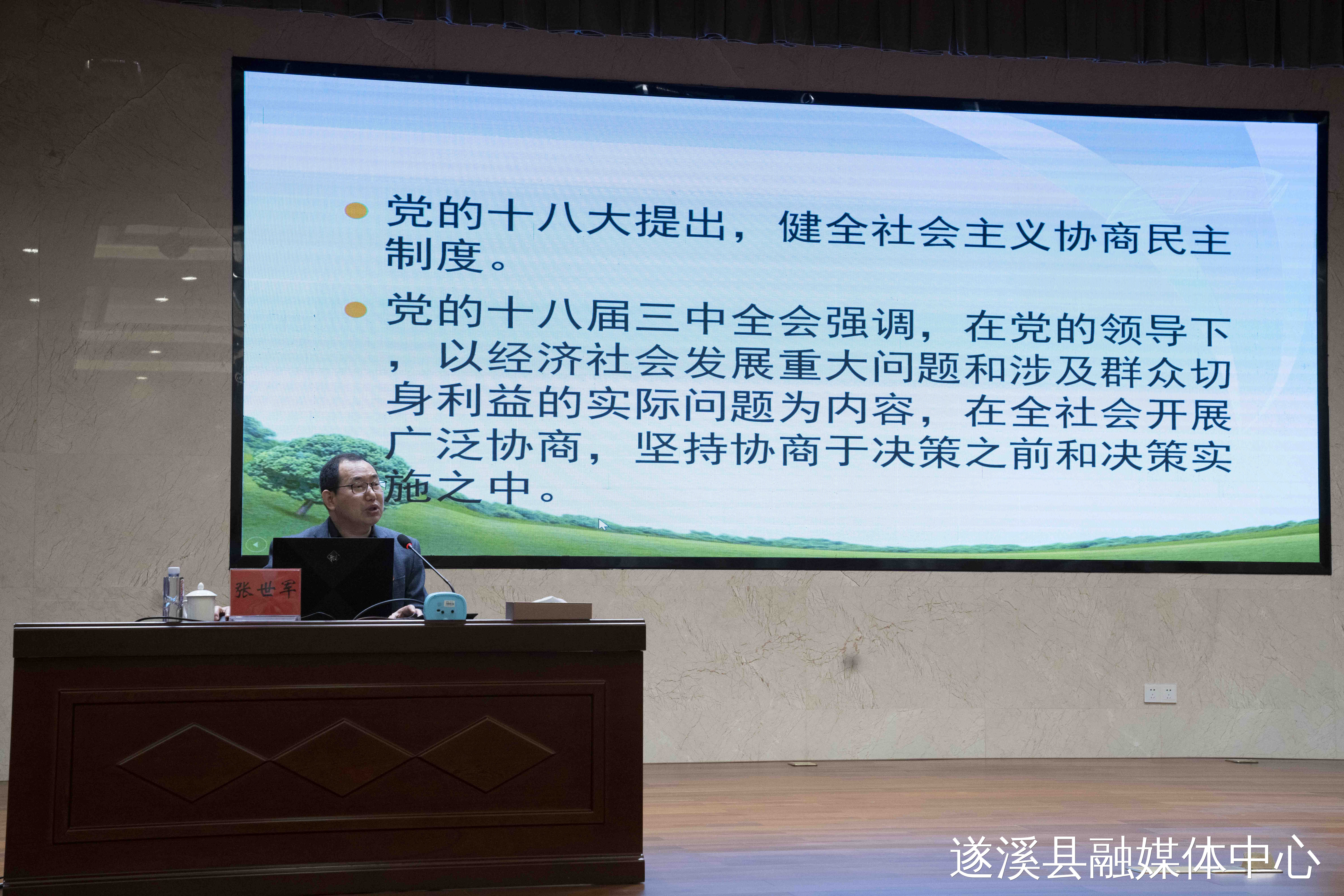 开班仪式后,湛江市委党校马克思主义教研室副主任、副教授张世军作了题为《协商民主的理论与实践》专题讲课。培训内容从何为协商民主、为何协商民主、如何协商民主三方面,从当代民主政治发展的视角,讲清楚中国协商民主的基本理论、制度价值、治理潜能及发展途径。课程思路清晰、逻辑严谨、框架完善,运用了理论和案例相结合的方式,论证了社会主义协商民主发展的可行性和必然性。