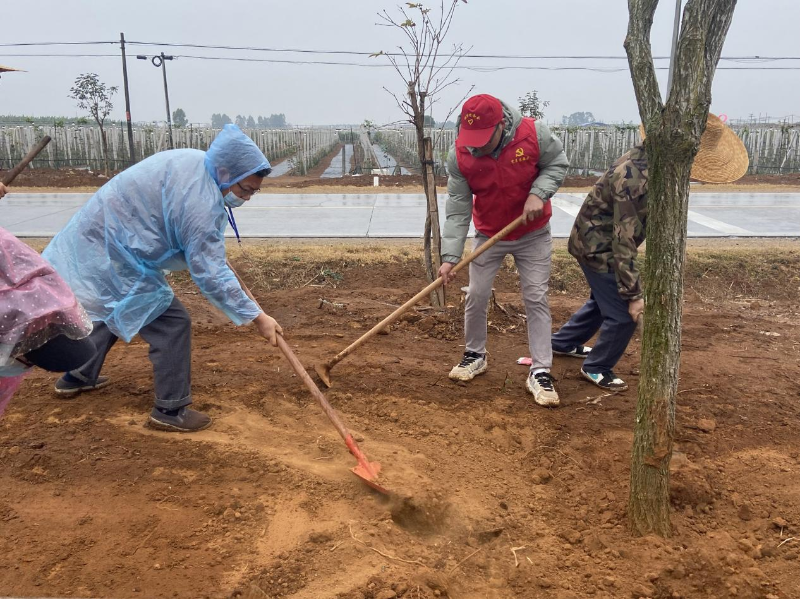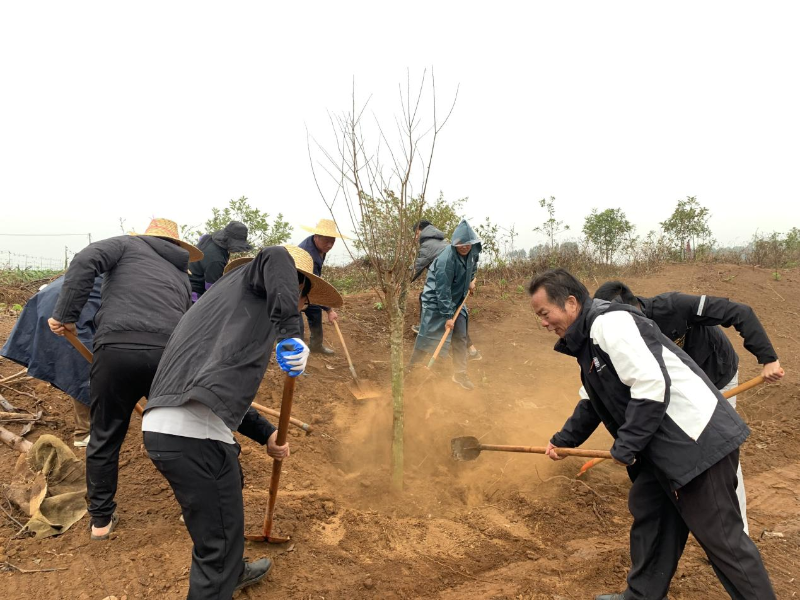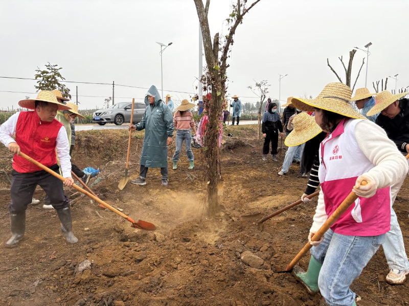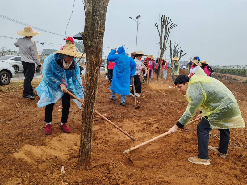 活动现场,全体人员热情高涨,干劲十足。尽管下起了细雨,但大家仍坚持分工协作,三五成组,有条不紊地挥锹铲土、扶苗填坑、浇水灌溉。雨水与汗水交织,更添一份齐心协力的干劲,现场气氛热烈而有序。