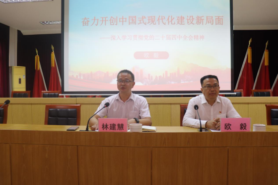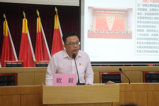为深刻领会和准确把握党的二十届四中全会的重大意义、精神实质和实践要求,切实把广大党员干部群众的思想和行动统一到党中央的决策部署上来,2025年11月10日上午9时,建新镇在镇四楼会议室召开党的二十届四中全会精神专题宣讲会。镇班子成员、镇全体干部职工、各机关单位负责人、各村党支部书记及主任参加会议。
