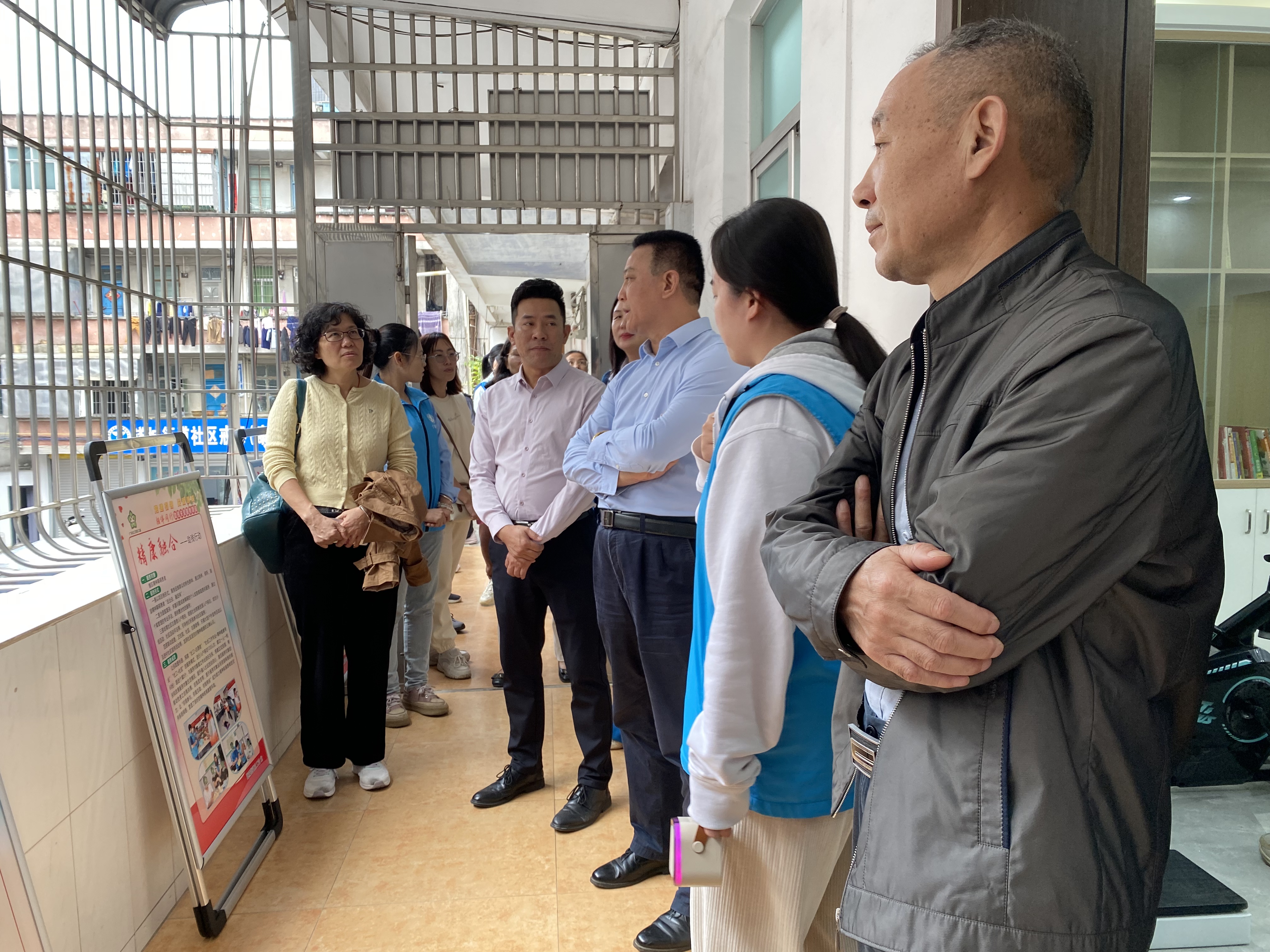 陈观光一行人首先来到遂城街道社工站城内社工点进行参观交流。社工点联络员陈诗文详细介绍了站点建设、服务开展及社区融入情况,展示了遂城街道在基层社工服务阵地标准化、服务项目化方面的探索与实践。