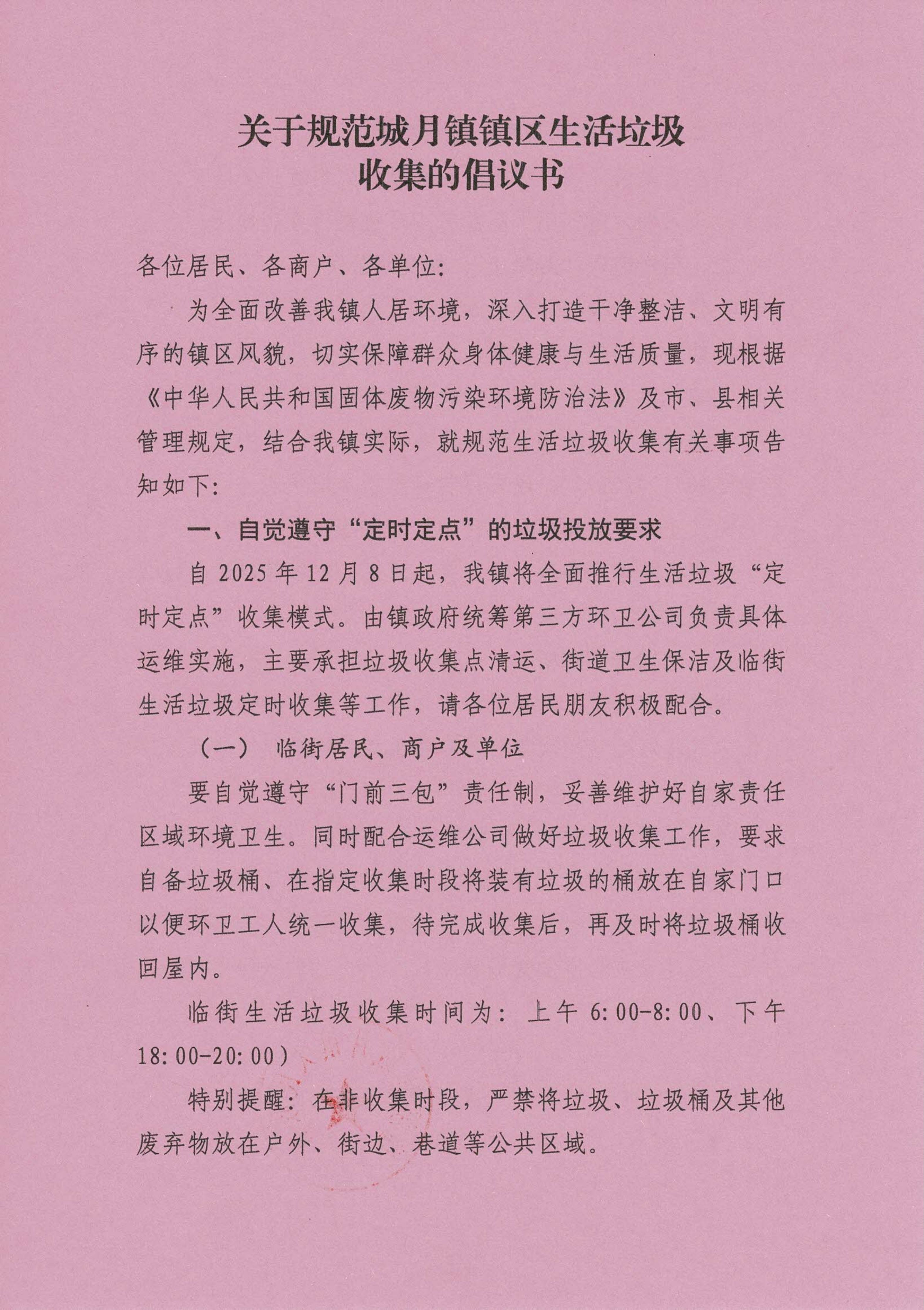 关于规范城月镇镇区生活垃圾收集的倡议书