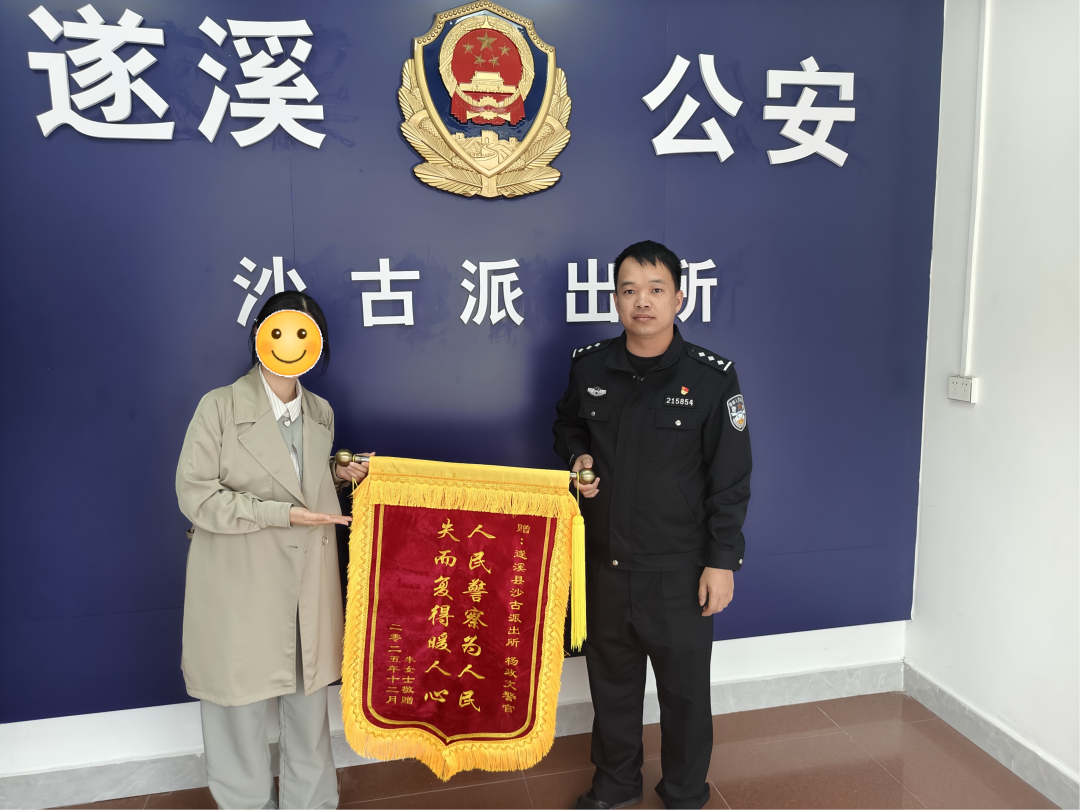小事不小看,小事不小办为切实解决群众“急难愁盼”问题杨政文同志决定送证上门。当天晚上他利用工作间隙驱车前往湛江将身份证交到朱女士手中朱女士接过失而复得的证件后连连感谢称赞民警心系群众、服务周到。事后朱女士专程来到沙古派出所将一面写有“人民公安为人民,失而复得暖人心”的锦旗送至杨政文同志手中并对该所民警热情高效为民解忧的工作作风给予高度赞扬。