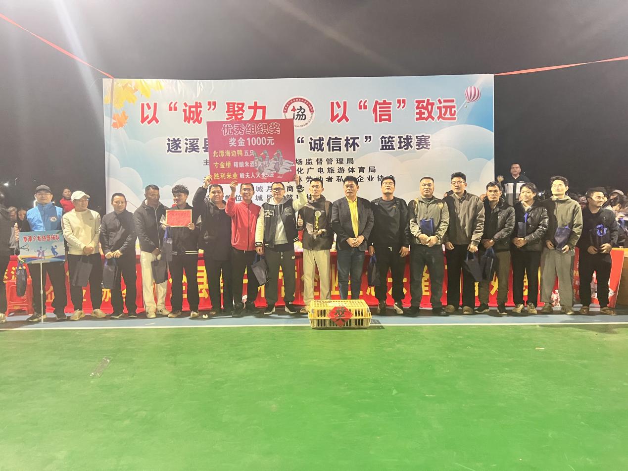 12月25日晚上,城月镇体育公园篮球场灯火通明、气氛热烈,由遂溪县市场监督管理局、遂溪县文化广电旅游体育局联合主办,遂溪县个体劳动者私营企业协会、城月镇商会承办,城月镇篮球协会协办的“诚信杯”篮球总决赛在此激情上演。经过激烈角逐,城月队脱颖而出,成功摘得桂冠。