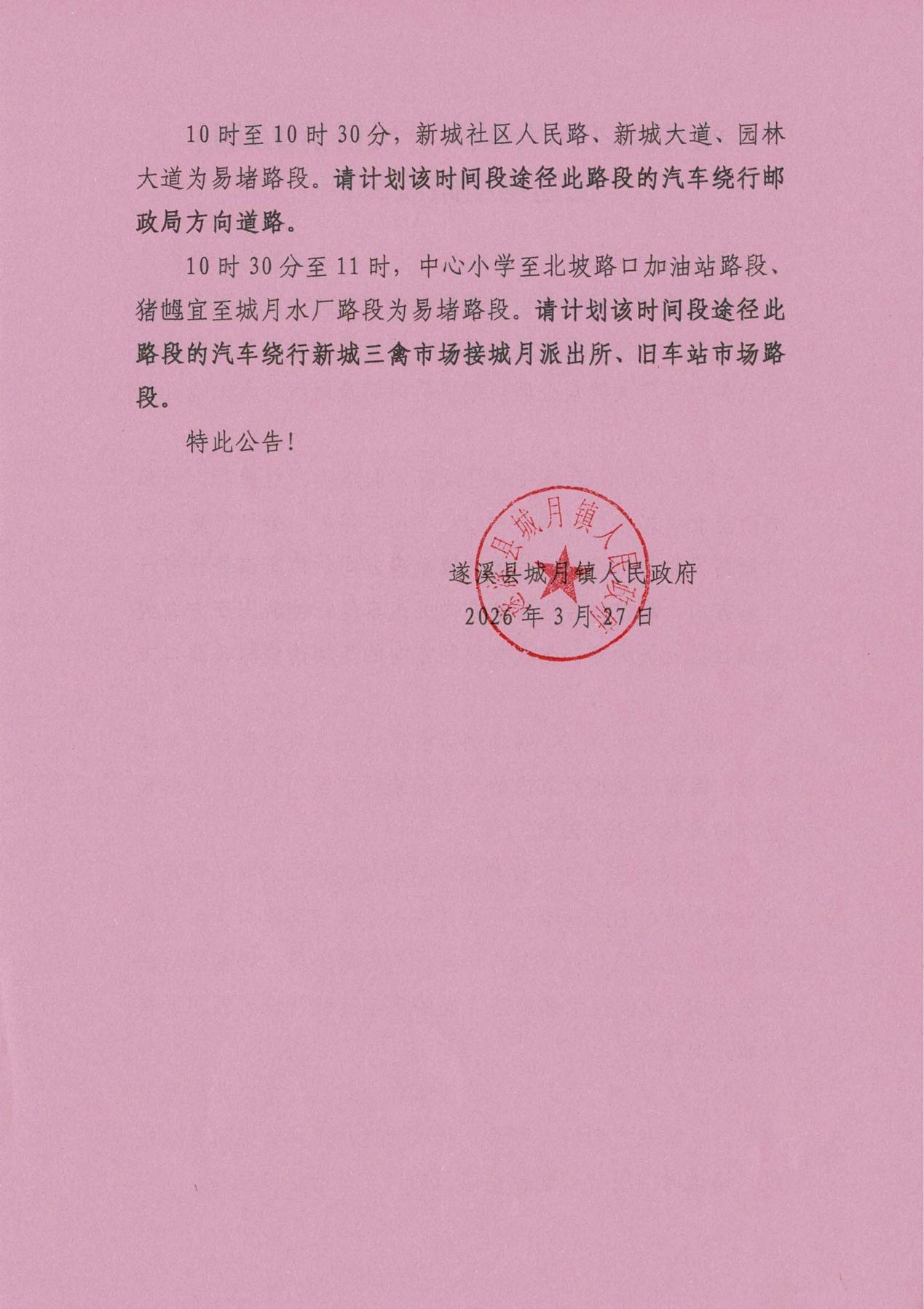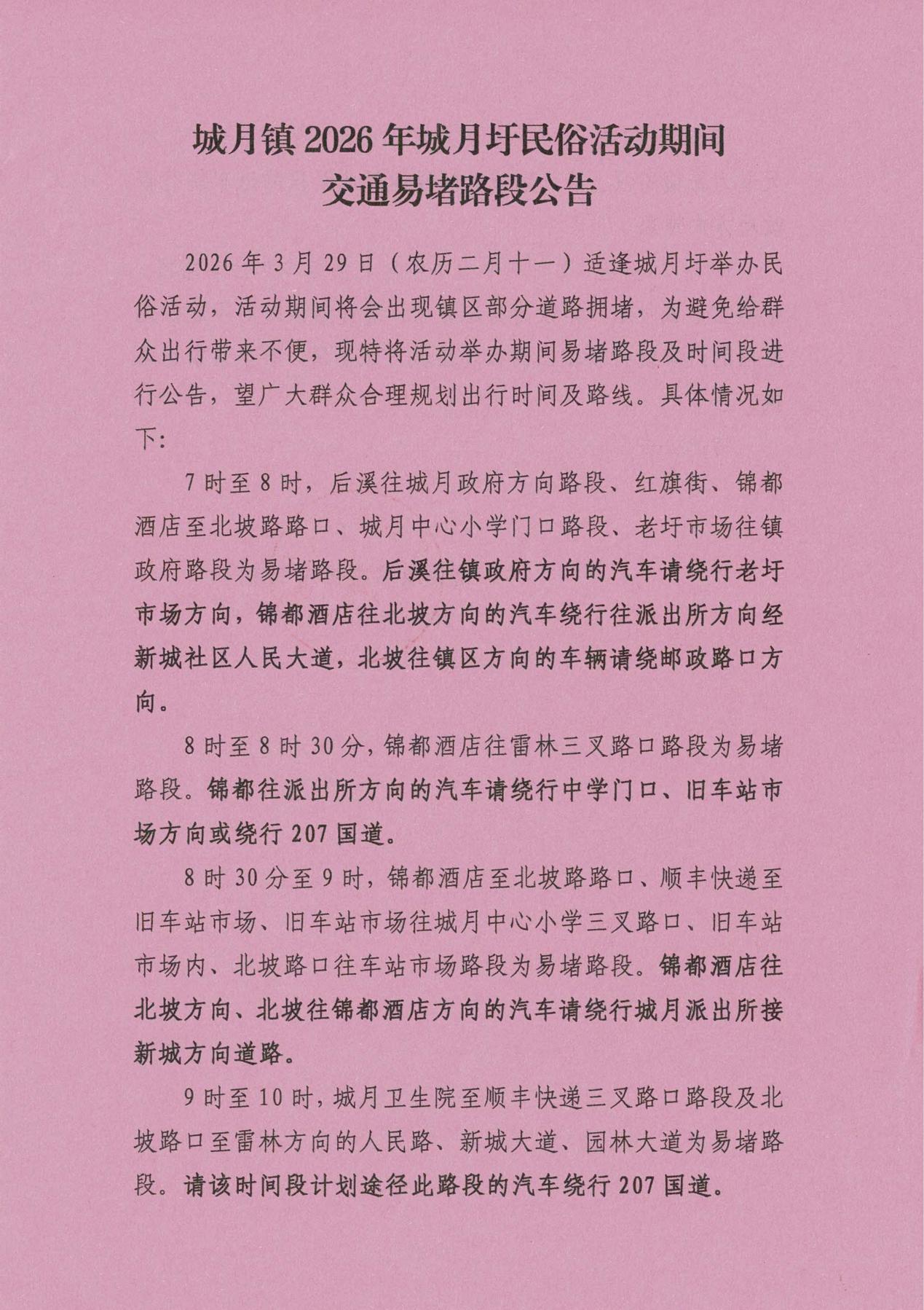 城月镇2026年城月圩民俗活动期间交通易堵路段公告